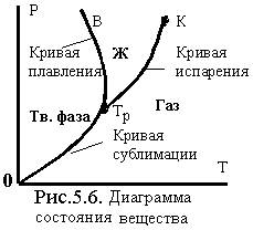азовый переход твердая фаза - жидкость (плавление) имеет свою зависимость ТрВ (кривая плавления). Возможно также испарение твердой фазы (сублимация) - кривая ОТр.