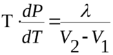 здесь - удельная теплота перехода (количество теплоты, выделяемое или поглощаемое 1 массы при фазовом переходе), V1 и V2 - удельные объемы разных фаз, т.е. объем, занимаемый единицей массы вещества