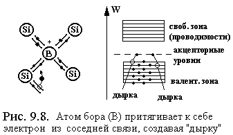 Если валентность примеси меньше валентности основного элемента, то получается полупроводник р - типа (см. рис.9.8). Например, примесь бора В - трехвалентна. Здесь недостает для комплекта связей одного электрона. Это еще не дырка. Но если из связи Si = Si сюда перейдет электрон, то появится настоящая дырка.