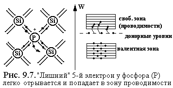 1. Если валентность примеси больше валентности основного элемента, то получается полупроводник n – типа (см. рис. 9.7). Например, если атом фосфора Р (5-ти валентный) замещает основной атом кремния (4-х валентный),то 5-й электрон у Р очень слабо держится, легко отрывается и становится свободным (электроном проводимости).