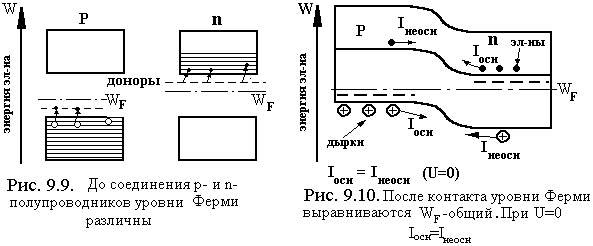 В n – полупроводнике – основные носители тока – электроны, в р – типе полупроводника основные носители – дырки (см. рис.9.9). При контакте электроны из полупроводника n – типа диффундируют к р – типу, а дырки, наоборот, из п/п р – типа движутся к п/п n – типа. При этом область р заряжается (-), а n - область (+). Этот переход будет проходить до тех пор, пока создавшееся внутреннее электрическое поле не станет этому препятствовать. При этом, в равновесии уровни Ферми сравниваются (см. рис.9.10), а ток основных носителей Iосн будет равен току неосновных носителей Iосн = Iнеосн