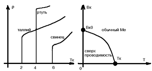 Рис. 9.12. а) Зависимость удельного сопротивления ρ от температуры для некоторых металлов. б) Зависимость критического магнитного поля Вк от температуры сверхпроводника.