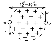 еорию сверхпроводимости создали Бардин, Купер, и Шриффер (теория БКШ). Ее суть следующая. Электрон немного притягивает к себе соседние положительные атомы решетки. Электрон и деформированная решетка создают положительную систему, к которой притягивается второй электрон. Наиболее выгодный режим создается, когда два электрона вращаются по кругу вокруг деформированной положительной области решетки (см. рис. 9.13).