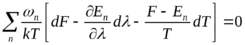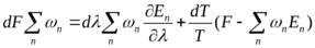 Для вывода количественного соотношения исходим из условия нормировки n exp (F – En) / kT = 1. Продифференцируем это равенство, рассматривая его левую сторону как функцию Т и некоторых величин 1, 2,… характеризующих внешние условия, в которых находится рассматриваемое тело. Уровни энергии En зависят от значений 1, 2,…, как от параметров. Производя дифференцирование пишем: