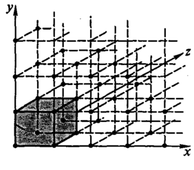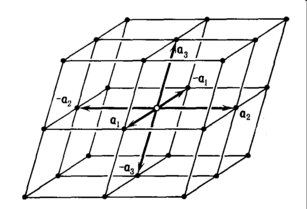 При трансляции узла кристаллической решетки одновременно в трех различных направлениях a1, а2, а3 (или, что эквивалентно a, b, c, соответственно) с периодом трансляции, соответственно, a, b, c, образуется пространственная решетка. Положение любой точки в этом случае определяется суммой перемещений: