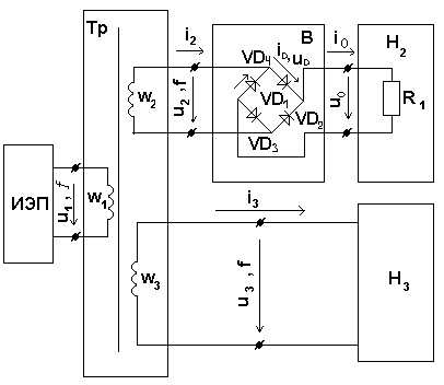 В данной курсовой работе представлен расчет однофазного низковольтного силового трансформатора малой мощности как структурного элемента источника вторичного электропитания, работающего в длительном режиме. Трансформатор имеет ряд обмоток. Первичная обмотка с числом витков w1 подключена к источнику электропитания, вырабатывающему переменное синусоидальное напряжение U1 и частотой 400 Гц. С двух групп вторичных обмоток с числами витков w2 и w3 снимаются переменные напряжения соответственно U2 и U3 той же частоты. Вторичная обмотка с числом витков w2 через соответствующий нерегулируемый выпрямитель В и выпрямленное напряжение U0, снабжает электроэнергией нагрузку H3, имеющую чисто активный характер, требующую питание постоянным током. Однофазная вторичная обмотка с числом витков w3 подключена непосредственно к нагрузке H3, получающей питание переменным током, частота которого совпадает с частотой источника. На рис. схемы протекают следующие токи: i1 – переменный ток, потребляемый первичной обмоткой трансформатора; i2- переменный ток в фазе вторичной обмотки с числом витков w2; i0 – постоянный по направлению и пульсирующий по величине (выпрямленный) ток, питающий нагрузку H3; i3 – переменный ток, протекающий во вторичной обмотке с числом витков w3 и нагрузке H3.