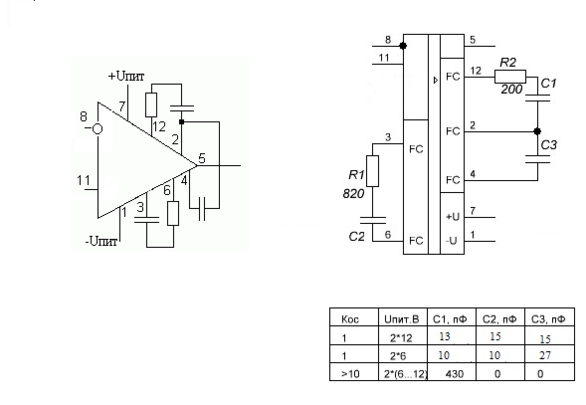 | Тип | UИП В | I потреб мА | Uвых .max. B | RН.min кОм | KУ собствен. коэф. усилне. | Uвх. сф max. B | Iвх. нА | ∆Iвх. нА | Rвх. MОм | Rвых. Ом | fT МГц | Внутренняя коррекция |