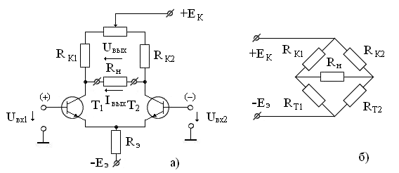 Рис. 18. Дифференциальная схема УПТ (а) и мост сопротивлений (б)