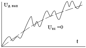 Первое условие выполнить сложнее, т. к. отсутствие емкостей приводит к возникновению проблемы дрейфа нуля УПТ рис. 17 (изменение выходного напряжения усилителя Uд.вых при отсутствии изменения полезного входного напряжения), вызванного воздействием на УПТ дестабилизирующих факторов, таких как изменение температуры, старение элементов, нестабильность источника питания, электромагнитные помехи и т. д. УПТ может усиливать входные сигналы Uвх, превышающие напряжение дрейфа усилителя, приведенного ко входу