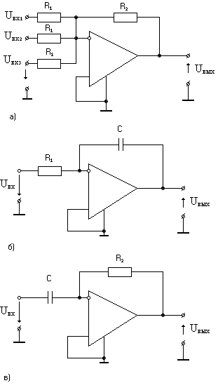 Суммирующий усилитель (сумматор). Если на вход ОУ подается несколько входных напряжений Uвх1 Uвх2 Uвх3, а R1 = R2 (рис.22а), то