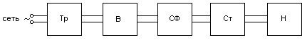 Структурная схема выпрямительного устройства показана на рис.30. В нее входит: Тр - трансформатор, изменяющий величину получаемого от сети переменного напряжения в соответствии с необходимой величиной напряжения на выходе выпрямителя; В – выпрямитель, содержащий один или несколько вентилей (диодов); СФ – сглаживающий фильтр, уменьшающий пульсации выпрямленного напряжения; Ст - стабилизатор, поддерживающий постоянное напряжение на нагрузочном устройстве; Н – нагрузочное устройство (например, нагрузочный резистор).