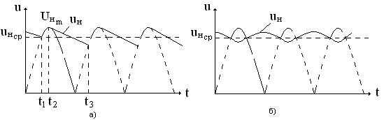 (период времени t1 – t2 рис.34а), а затем разряжается через резистор RН (период времени t2 – t3 рис. 34а). Если постоянна времени разряда конденсатора = Сф RН значительно превышает период времени Т изменения uН, то напряжение на конденсаторе при разряде уменьшается несущественно за время (t2 – t3 ). Это приводит к значительному увеличению среднего значения