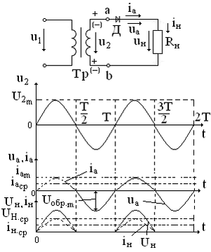 периоды диод Д открыт. Когда потенциал точки, а отрицателен по отношению к потенциалу точки b, диод закрыт, ток в цепи равен нулю. Таким образом, ток в резисторе RН появляется только в один из полу периодов напряжения u2, а схема называется однополупериодной. При принятых допущениях (идеальный диод) в положительный полупериод напряжения u2 величина напряжения на нагрузочном резисторе равна величине u2 , а на диоде нулю, а в отрицательный полупериод uн =0, а величина uа =u2 . В этой схеме U