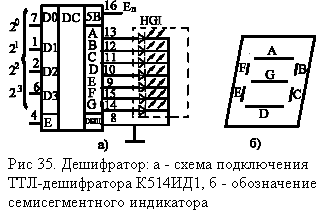 Условное обозначение микросхем дешифраторов на корпусе микросхемы после номера её серии имеет первой букву И (для всех цифровых устройств), а второй – букву Д. На рисунке 35а представлена схема подключения ТТЛ – дешифратора К514ИД1 для управления семи сегментным цифровым индикатором на светодиодах с объединёнными катодными выводами. Дешифратор работает обычным образом при высоком уровне сигнала на входе Е. Сигнал низкого уровня на этом входе независимо от информации на входах