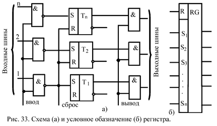 Основные элементы регистра – двоичные ячейки, в качестве которых применяются триггеры. Число ячеек определяется числом двоичных разрядов «слова» (длиной слова), на которое рассчитан регистр.