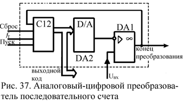 , срабатывает компаратор DA1, прекращая работу счётчика. Изменение состояния DA1 используется в качестве сигнала «Конец преобразования», а выходной код счётчика соответствует цифровому эквиваленту входного аналогового сигнала.