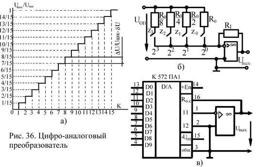 ринцип действия простейшего ЦАП поясняет схема на рисунке 36б. Основу ЦАП составляет матрица резисторов, подключаемых ко входу операционного усилителя ключами, которые управляются двоичным кодом (например, параллельным кодом регистра или счётчика).