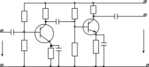 Двухкаскадный усилитель с резистивно-емкостной связью на биполярных транзисторах.