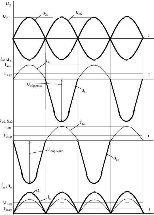 Считаем, что напряжение на каждой половине вторичной обмотки трансформатора равны между собой u2а = u2б = u2.