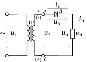 Схема содержит трансформатор ТР, в цепи вторичной обмотки которого включены последовательно диод Д и сопротивление нагрузки Rн.