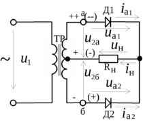 Выпрямитель состоит из трансформатора со вторичной обмоткой имеющей среднюю точку, двух диодов Д1 и Д2 и нагрузочного резистора Rн, включенного между средней точкой трансформатора и катодами двух диодов.