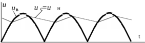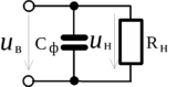 Емкостной фильтр (Рис.7а) включается параллельно нагрузочному резистору и шунтирует его для составляющей тока. При этом конденсатор Cф попеременно заряжается под действием выпрямленного напряжения uВ, а затем разряжается через резистор Rн. Если постоянная времени разряда конденсатора = CфRн значительно превышает период напряжения u2, то напряжение при разряде уменьшается несущественно (Рис.7б), что приводит к значительному увеличению среднего значения напряжения на нагрузочном резисторе Uн.ср и к снижению степени пульсации выпрямленного напряжения.