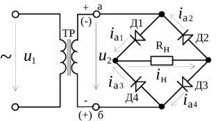 В этой схеме диоды Д1-Д4 включены по мостовой схеме, к одной диагонали которой подведено переменное напряжение u2, а к другой подключен нагрузочный резистор Rн.