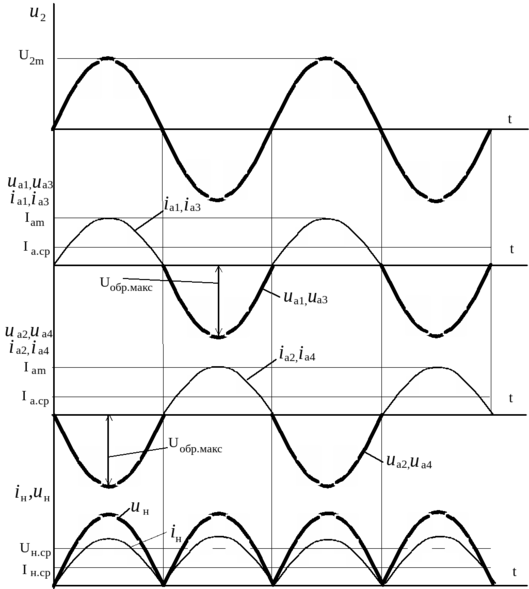 Обратное напряжение на диодах в закрытом состоянии равно соответственно Uобр.макс = U2m.