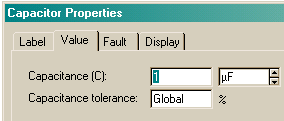 Для изменения емкости конденсаторов связи открываем диалоговое окно конденсаторов и устанавливаем необходимую емкость (например,Capacitance 1мкФ).
