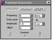 При снятии амплитудно-частотных характеристик усилительных устройств необходимо изменять частоту входного сигнала при неизменной его амплитуде. Для этого открываем диалоговое окно функционального генератора и задаем входной сигнал синусоидальной формы.