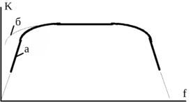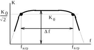 Эта характеристика усилителя отражает зависимость модуля коэффициента усиления К от частоты входного сигнала f. На рисунке 3 приведена наиболее часто встречающаяся АЧХ. На ней можно выделить рабочую область усилителя, лежащую между верхней fвг и нижней fнг граничными частотами усилителя, в которой коэффициент усиления усилителя К постоянен.