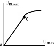 Эта характеристика (Рис.2) определяет зависимость амплитуды выходного напряжения усилителя от изменения амплитуды напряжения на входе Um.вых = f(Um.вх). Линейный участок аб соответствует пропорциональной зависимости этих напряжений, которые связаны между собой коэффициентом усиления усилителя К, постоянным на этом участке. Участок аб является рабочим участком усилителей. Участок амплитудной характеристики выше точки б является нелинейным и не используется при работе усилителей.
