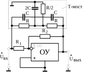 через “верхний” одинарный Т-образный мост (R, 2C, R) передается на вход усилителя в виде напряжения обратной связи