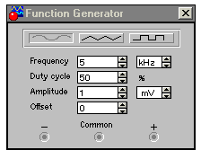 При снятии амплитудных характеристик усилительных устройств необходимо изменять амплитуду входного сигнала при неизменной частоте. Для этого открываем диалоговое окно функционального генератора и задаем входной сигнал синусоидальной формы.