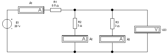 R1= 0,5 Ом и двух параллельно включенных R2=R3= 3 Ома, которая питается от источника постоянной ЭДС 20 В.