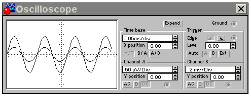 - Oscilloscope вызываем на экран вольтметры, генератор входного сигнала и осциллограф.