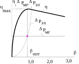 Из этой формулы видно, что к.п.д. растет до определенного значения, а потом падает, т.е. имеет место максимальное значение при оптимальном значении коэффициента нагрузки