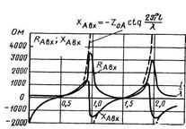 Рис. 6.7. Зависимость входного сопротивления симметричного вибратора (антенны) от его электрической длины