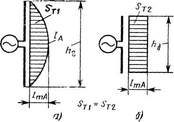 а — распределение тока в реальной антенне; б — эквивалентная антенна с той же «площадью тока» при его равномерном распределении
