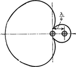 В других направлениях (рис. 6.21,а) разность хода между обеими излученными волнами .меньше, поскольку она всегда меньше отрезка А Б. По этим направлениям волны складываются, не совпадая по фазе, и суммарное поле получается меньше, чем в направлении оси системы (т. е. линии АБ, перпендикулярной осям вибраторов). При угле <р>45° происходит частичное взаимное уничтожение волн и при ф = 90°, т. е. в направлении, перпендикулярном оси системы, разность хода становится равной нулю и обе волны полностью взаимно уничтожаются. На рис. 6.21,а приведена диаграмма направленности такой противофазной системы в плоскости, перпендикулярной оси вибраторов. Диаграмма направленности в плоскости, проходящей через ось вибраторов, зависит от того, является ли каждый из них