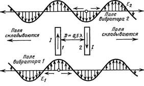 через отрезок времени t = D/c. Если расстояние D равно половине длины волны, то волна подойдет к (вибратору 2 через полпериода после того, как она была излучена вибратором 1. За это время ток в вибраторе 2, фаза которого на 180° отличается от фазы тока в вибраторе /, изменит фазу на 180° ч будет излучать волну, фаза которой совпадает с фазой волны, пришедшей от вибратора 1. При этом произойдет сложение обеих волн. Вполне очевидно, что аналогичная картина будет происходить при движении волн в противоположном направлении, т. е. в направлении от вибратора 2 к вибратору /.