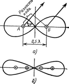 стояние в лолволны между противофазными излучателями не является обязательным. Противофазные антенны с уменьшенным расстоянием между вибраторами обладают значительно большей направленностью, чем рассмотренная нами система.