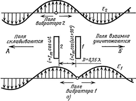 В противоположном направлении Б имеет место обратная картина. Пока волна вибратора 2, ток в котором отстает на четверть периода от тока вибратора /, достигнет последнего, пройдет четверть периода, и ток в вибраторе 1 к этому моменту времени уже на полпериода опередит ток вибратора 2, создавшего волну, подошедшую к вибратору /. Последняя окажется в противофазе с волной, излученной вибратором 1,