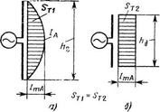 Антенны с одинаковой площадью тока излучают одинаковое количество энергии. Поэтому удобно характеризовать излучение антенны, заменяя ее некоторой прямолинейной воображаемой антенной, имеющей ту же площадь тока, но в которой ток одинаков по всей ее длине и равен току в пучности стоячей волны тока реальной антенны (рис. 6.9,6). Длину такой воображаемой ан