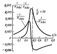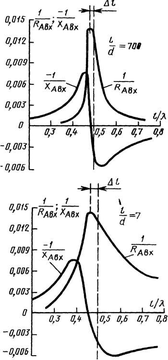 Из резонансных характеристик по- луволновых вибраторов различного диаметра, приведенных на рис. 6.8, видно, числу полуволн, появляется индуктивная составляющая входного сопротивления, для компенсации которой нужно несколько укоротить вибратор.