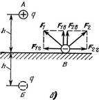 Такое же ноле создается, если металлическую поверхность убрать, а внизу на расстоянии 2h под зарядом в точке Б поместить второй заряд, равный по значению и противоположный по знаку первому заряду. Второй заряд называется зеркальным изображением первого. При этом поле в произвольной точке поверхности |будет определяться векторами Fi и F2 полей зарядов +q и —q. Поскольку заряды удалены от точки В на одинаковые расстояния, то векторы Fi и F2 одинаковы. Горизонтальные составляющие ЭТИХ ВеКТОрОВ FJr И F2r уничтожают друг друга, а вертикальные Fib и F2b складываются. Это и позволяет заменить действие проводящей поверхности действием «зеркального заряда».