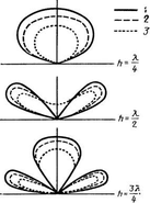 Рис. 6.27. Диаграммы направленности полуволнового вибратора над хорошо проводящей землей при различных высотах подвеса