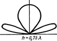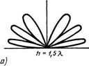 ИГоризонтальный провод, расположенный низко над землей (на высоте, малой по сравнению с длиной волны), практически ничего не излучает, так как •при этом образует со своим зеркальным изображением обычную двухпроводную длинную линию. С увеличением высоты расстояние между антенной и ее зеркальным изображением растет, и, когда оно становится соизмеримым с длиной волны, они образуют излучающую противофазную систему. Естественно, что вид характеристики излучения изменяется в зависимости от высоты. На рис. 6.27,а приведены диаграммы направленности расположенного над землей по- луволнового вибратора в плоскости, перпендикулярной его оси. Рассмотрение этих диаграмм приводит к выводу, что горизонтальная антенна, расположенная над хорошо проводящей землей, не излучает энергию вдоль поверхности земли.