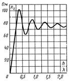 Рис. 6.28. Изменение сопротивления излучения горизонтального полуволнового вибратора от высоты подвеса над землей