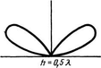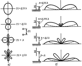 Несколько иначе обстоит дело с излучением несимметричных заземленных антенн. Они вместе со своими зеркальными изображениями образуют симметричные антенны, характер излучения которых целиком определяется их длиной. Поэтому для нахождения диаграмм направленности нужно пользоваться соответствующими характеристиками излучения симметричных антенн различной длины, приведенными на рис. 6.19.